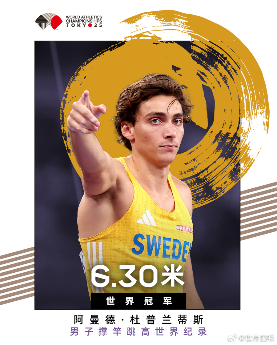昨晚,2025东京田径世锦赛诞生首项世界纪录。在男子撑杆跳高决赛中,瑞典运动员杜普兰蒂斯越过6.30米,在实现世锦赛三连冠的同时,个人第14次改写世界纪录。这也是他今年第4次刷新纪录。