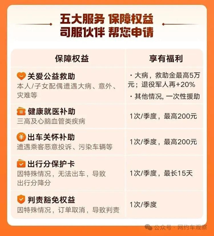 “橙意保障计划”升级为“滴滴司机服务计划”,在关爱公益救助、健康就医补助、出车关怀补助、出行分保护卡等方面给予保障。